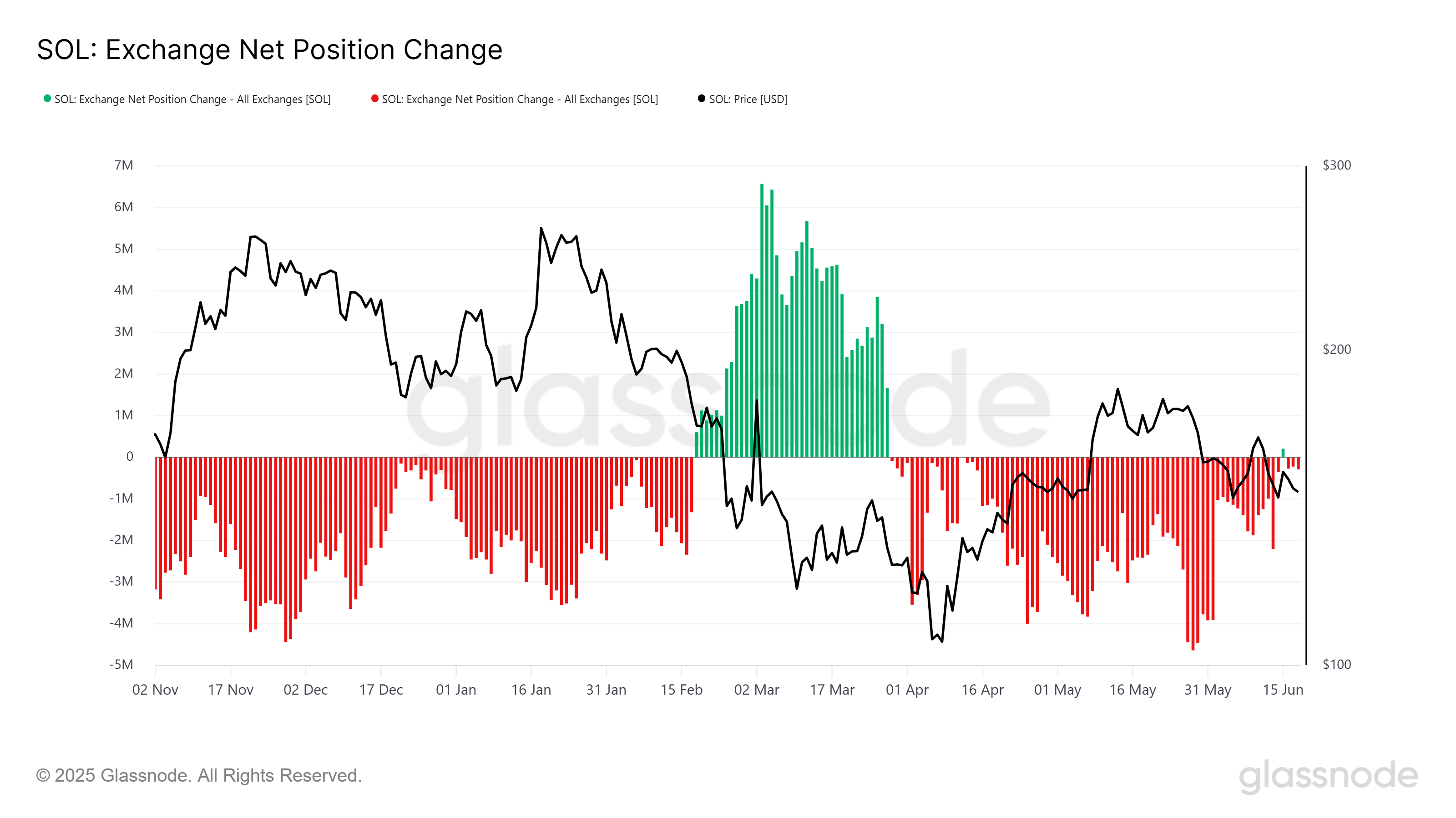 Additionally, the Exchange Net Position Change chart reveals consistent SOL withdrawals from exchanges, a trend that has recently begun to rise again (i.e., SOL is moving back into exchanges). This indicates growing investor confidence, as holding SOL off exchanges often signals accumulation for future gains. The data shows a significant net outflow, with peaks of -4.6 million SOL on May 28, followed by a recent uptick in deposits, which falls in line with the price’s current dip.