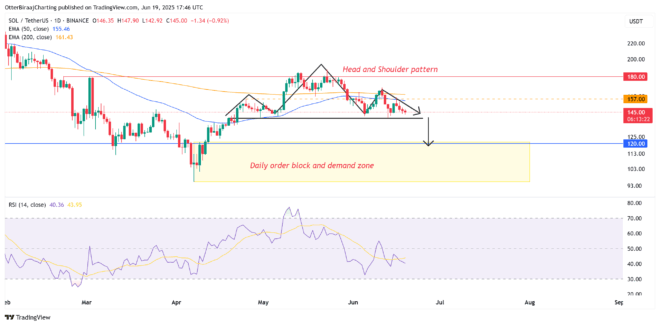 On the 1-day time frame, SOL shows a head-and-shoulders pattern, which is a bearish reversal signal. A breakdown below its $140 neckline level, confirmed by a volume spike, could lead to a bearish continuation.