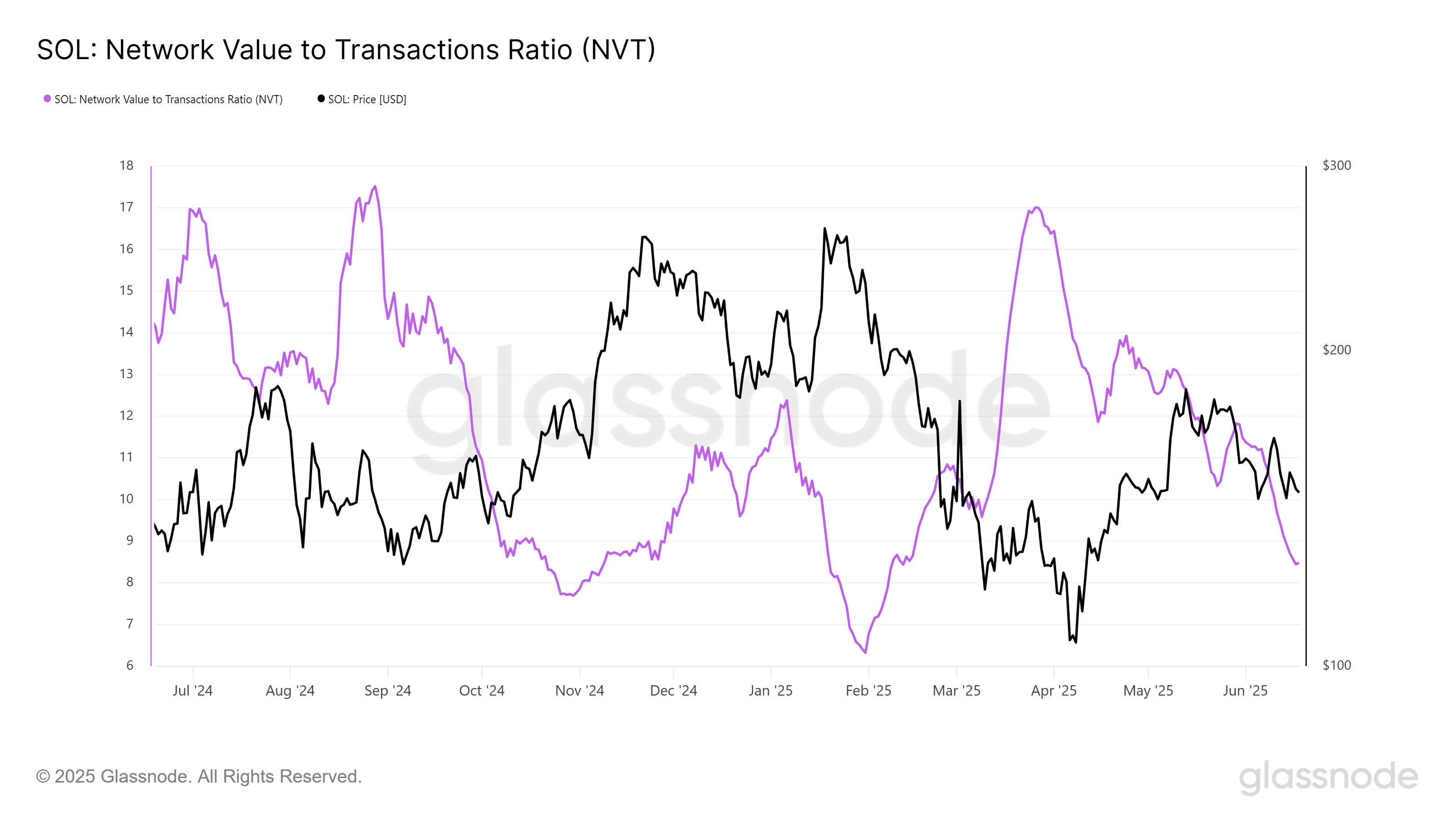 Despite a bearish outlook, onchain data for Solana continues to paint a bullish picture. According to Glassnode, the Network Value to Transactions Ratio (NVT) has dropped below 10, its lowest score since February 2025. This suggests strong network usage relative to its market value, a key indicator of long-term potential, despite SOL’s price fluctuating under $150.
