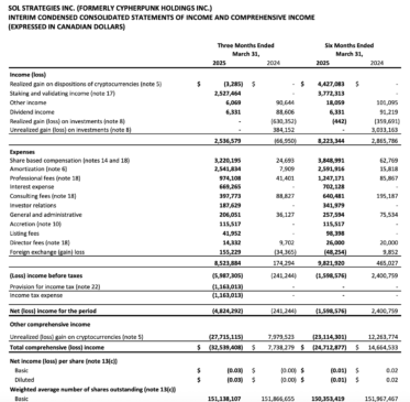 Despite the rise in revenue driven by staking, SOL Strategies’ operating and non-operating expenses weighed on the quarterly performance. The company recorded CA$$8.52 million ($6.21 million) in total expenses during the quarter, including over CA$3.22 million ($2.35 million) in share-based compensation and CA$2.54 million ($1.85 million) in amortization related to recent acquisitions of validator infrastructure.