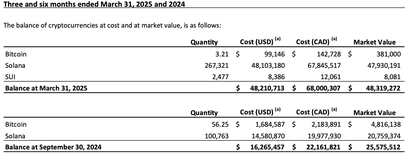 SOL Strategies, which announced an issuance of $500 million in convertible notes in April, stacked more SOL and added SUI, but dramatically decreased its Bitcoin (BTC) holdings. Overall, its cryptocurrency holdings value stood at CA$48.3 million CAD ($35.2 million) on March 31.