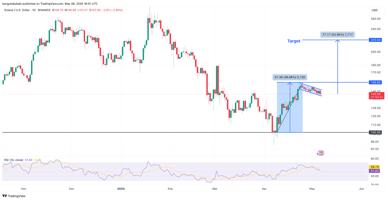 SOL bull flag points to $220