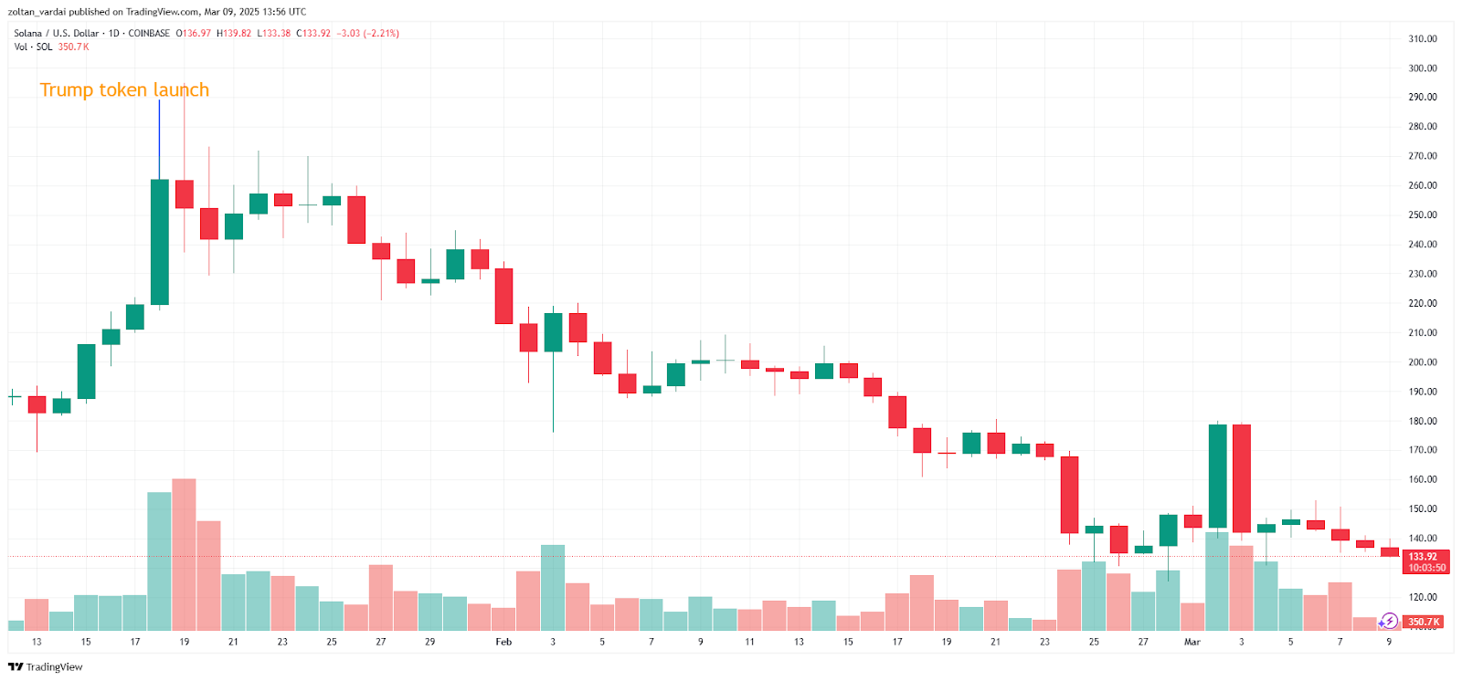 SOL is currently down 49% since the launch of Trump’s Official Trump (TRUMP) token, from $261 on Jan. 18 to $133 on March 9.