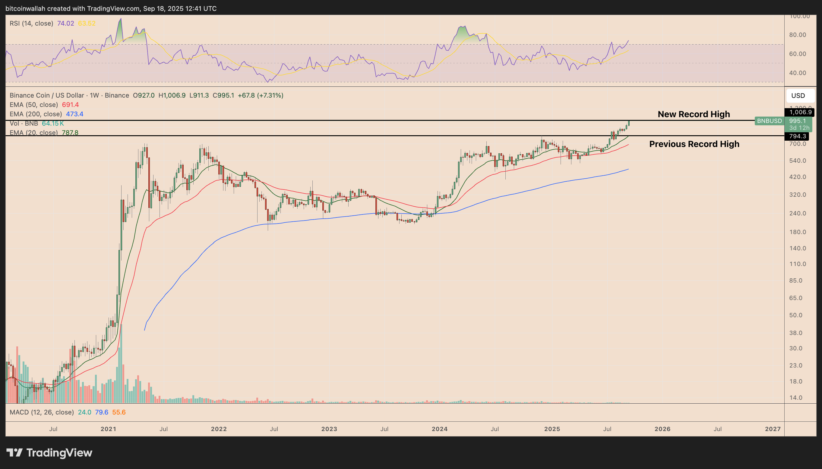 For BNB, this setup matured in August 2025, when it reclaimed its previous all-time high of $794.30. The breakout quickly gathered momentum, and within weeks, BNB extended its rally to a new record peak above $1,000 on Thursday.