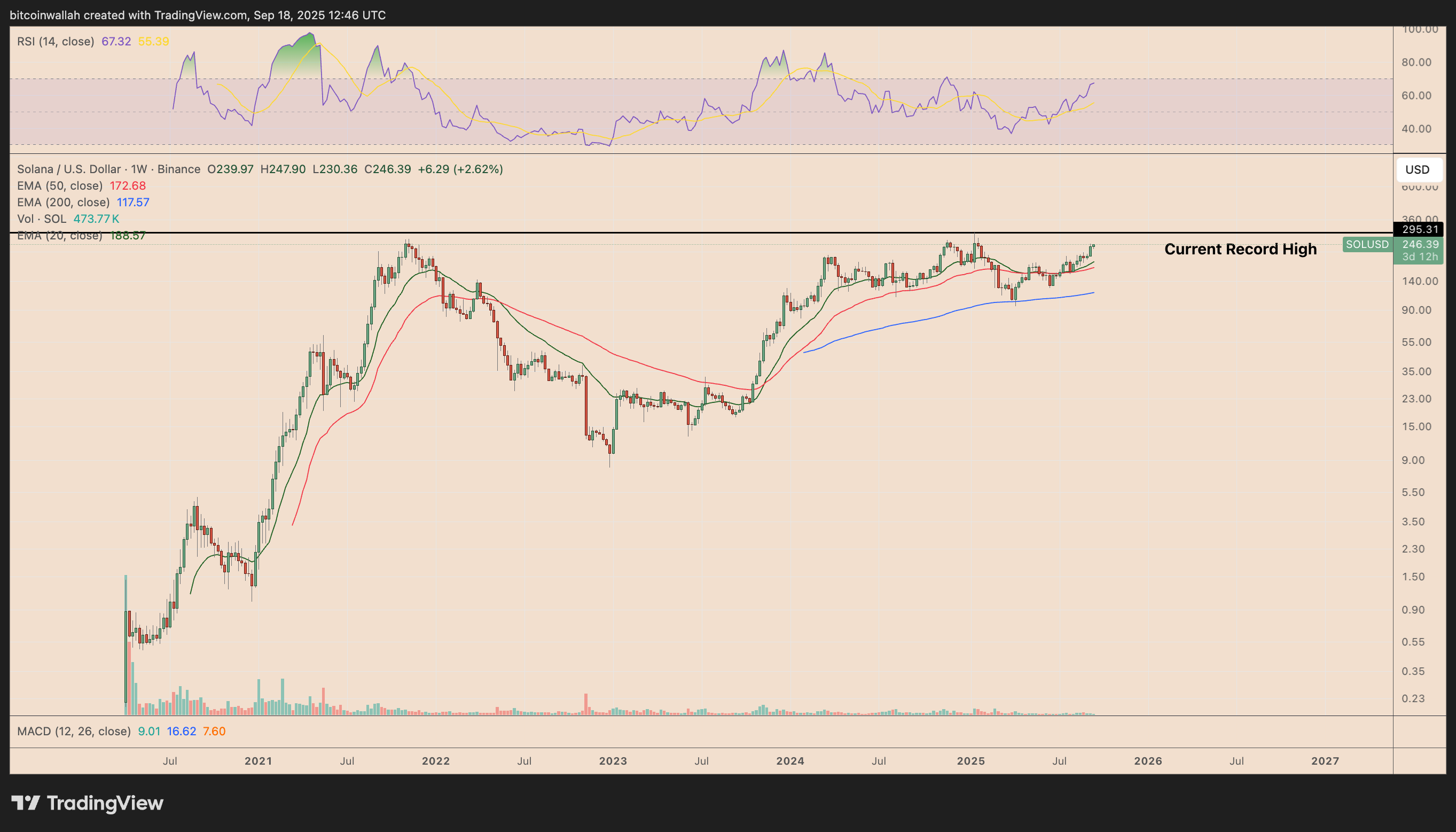 Solana now appears to be entering the same breakout phase that fueled BNB’s parabolic rise, eyeing a breakout over its current record high at around $295 within a month, up about 20% from current levels.