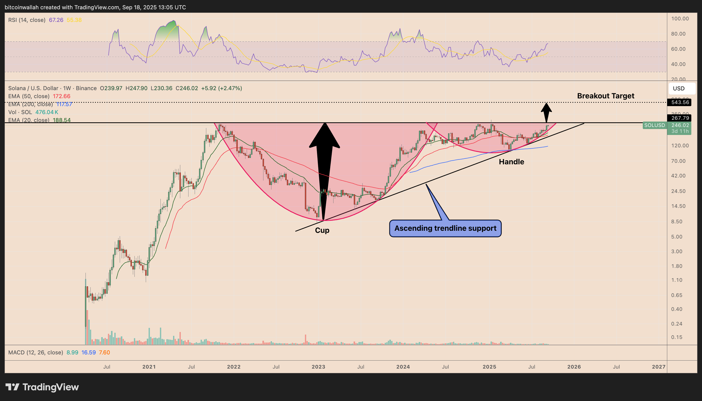 Solana is painting a classic bullish continuation pattern known as a “cup and handle,” positioning it for a potential breakout to new highs.