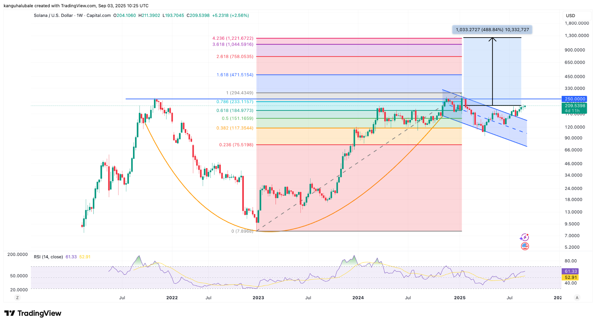 Bullish technicals suggest that SOL price can reach $1,000 if the resistance between $210-$250 is broken.
