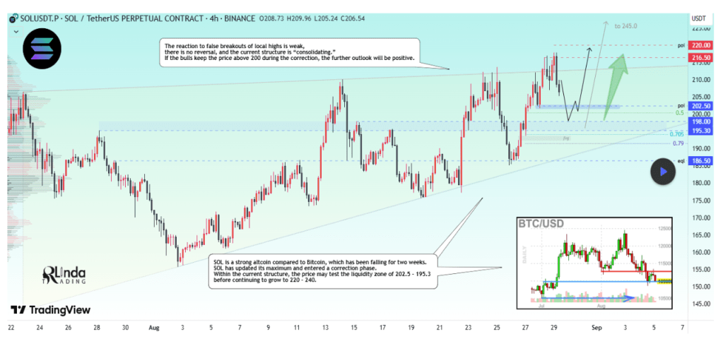 Crypto analyst RLinda on the TradingView platform described Solana as stronger than the market. According to the analyst, Solana’s recent price behavior, where it managed to remain steady above $200 even after pulling back from a new multi-month high of $218, its highest price point since February.