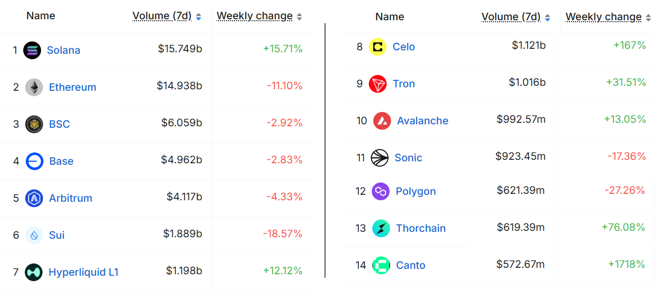 One could argue that Solana’s TVL roughly matches the Ethereum layer-2 ecosystem in deposits. However, this comparison overlooks Solana’s strong position in decentralized exchange (DEX) volumes. For example, in the seven days ending April 16, trading activity on Solana DApps totaled $15.8 billion, exceeding the combined volume of Ethereum scaling solutions by more than 50% during the same period.