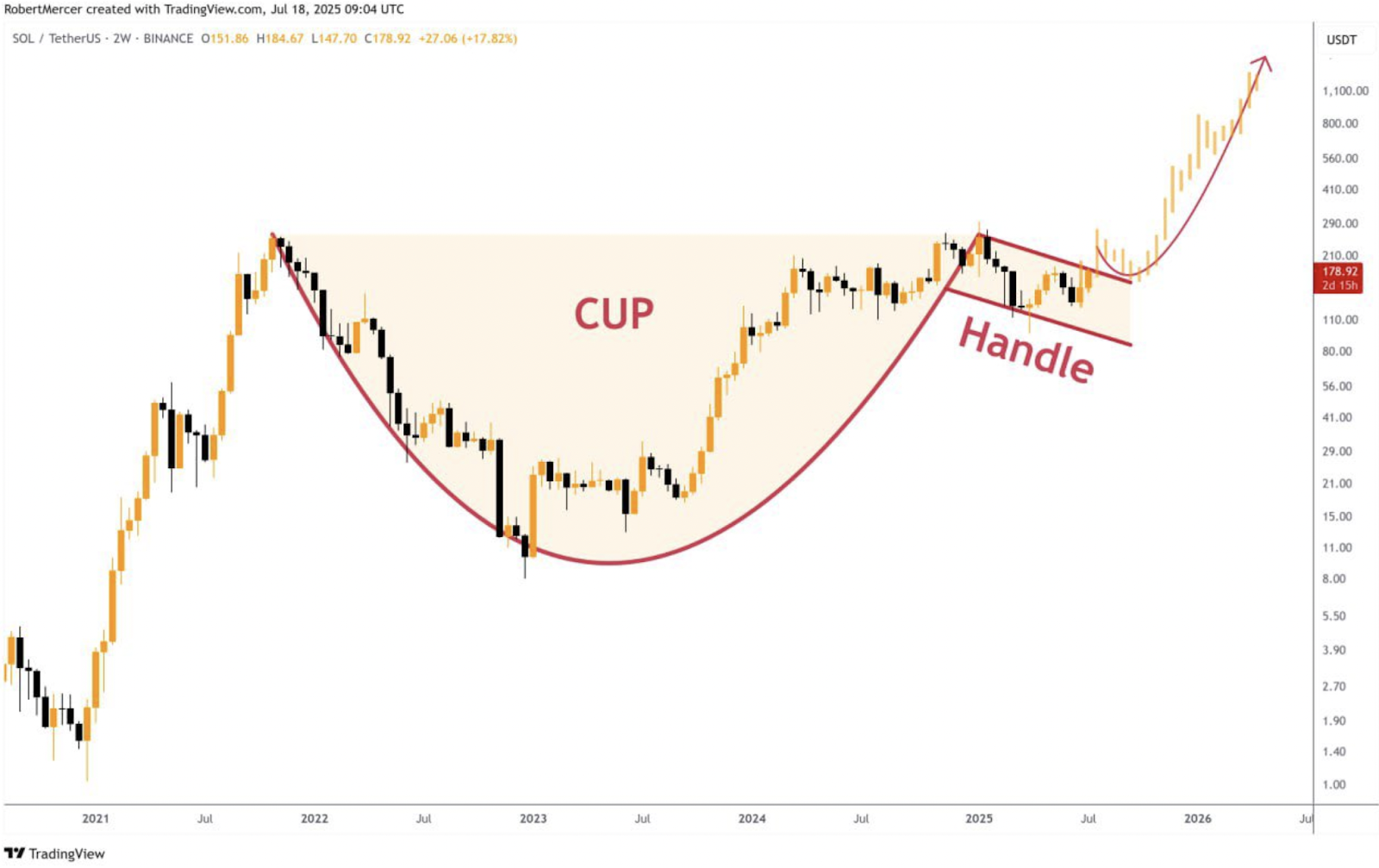 That puts SOL’s cup-and-handle breakout target for 2025–2026 at around $6,300, up by more than 3,000% from current price levels.