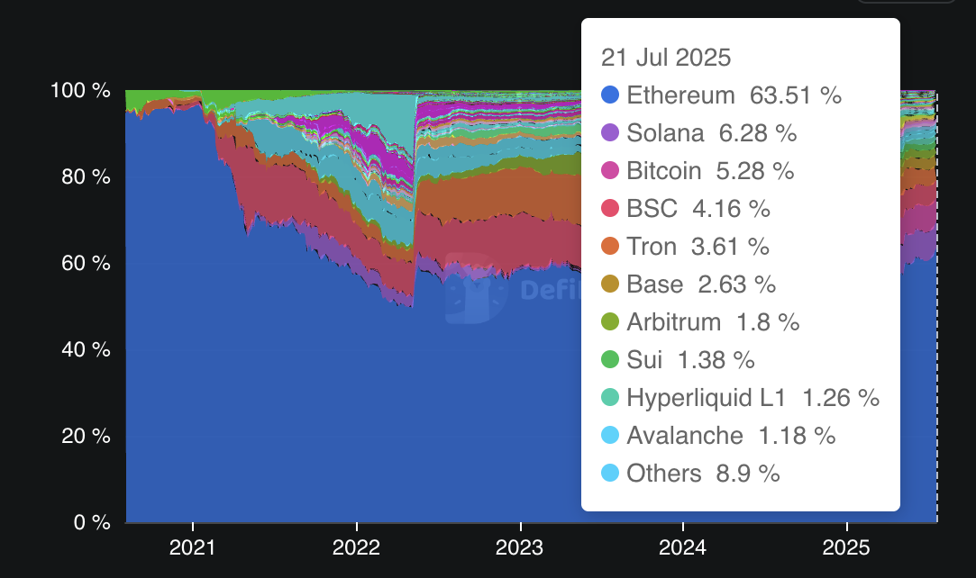 Solana boasts its position as the second-largest blockchain in terms of TVL with a market dominance of 6.28%, behind Ethereum, which is roughly ten times bigger, comprising 68%.