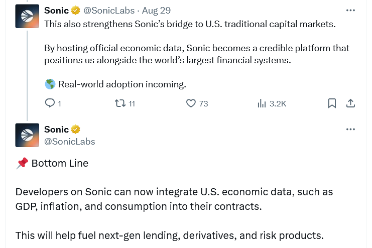 Meanwhile, Sonic was listed as a participant in the US Department of Commerce’s program to publish economic data onchain, leveraging Chainlink’s and Pyth’s blockchain oracle services.