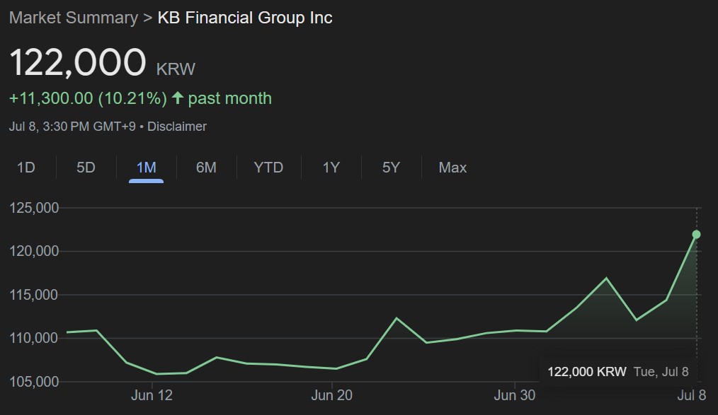 Kookmin Bank, a subsidiary of KB Financial Group, also filed for stablecoin-related trademarks on June 23. The group’s shares saw a modest initial gain a day after the filing.