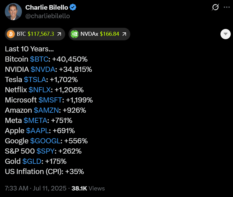 Analyst Charlie Bilello highlighted Bitcoin’s meteoric rise over the past decade compared to these and other assets, underscoring BTC’s standout outperformance.
