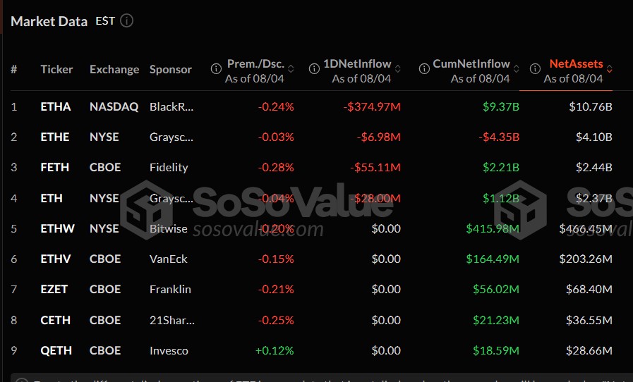 SoSoValue data shows that asset manager BlackRock’s iShares Ethereum Trust (ETHA) took the biggest hit on Monday, seeing nearly $375 million in net outflows. The ETF still has a cumulative net inflow of $9.3 billion and net assets of $10.7 billion.