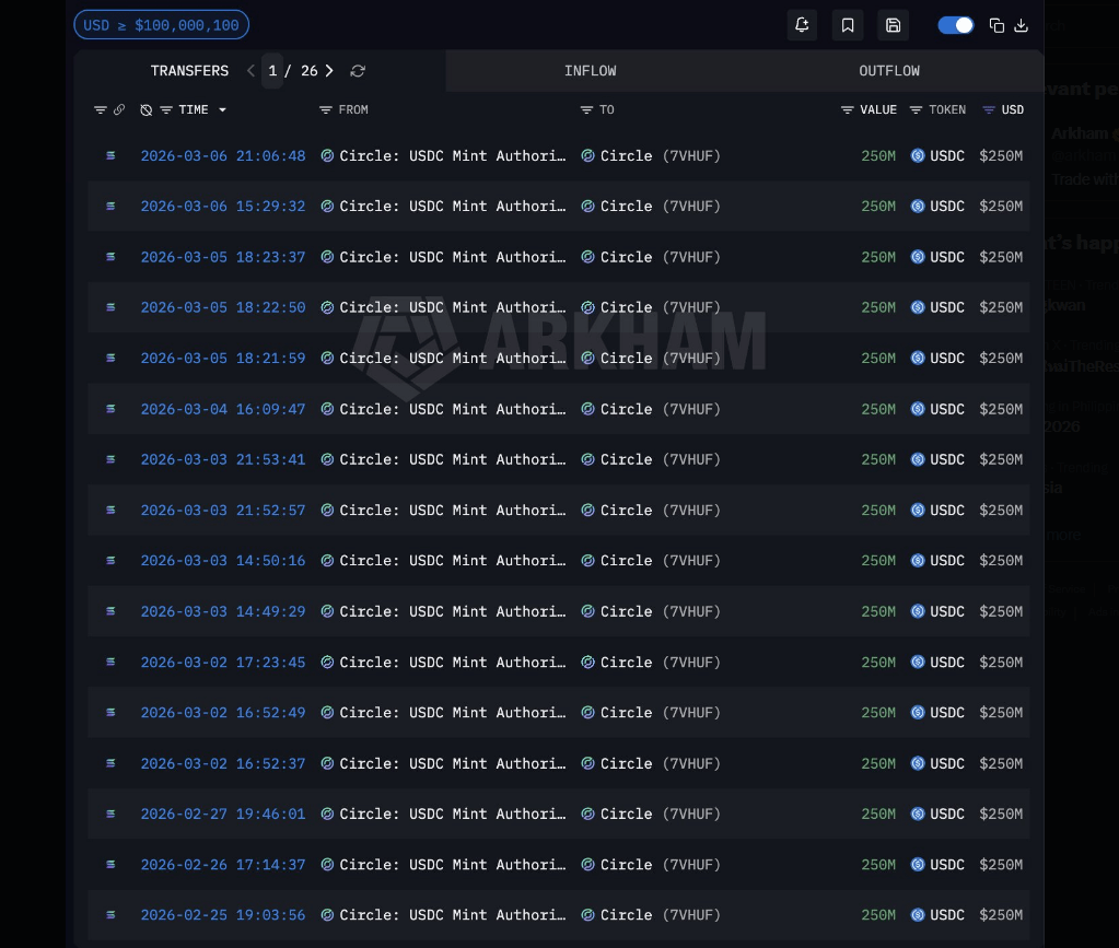 Reports indicate Circle has already minted more than $3 billion in USDC in March’s first week, with Arkham data showing one single mint of $250 million on Solana.