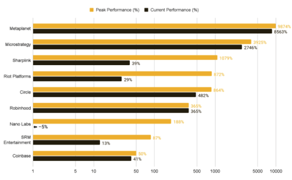 Crypto-related firms also saw significant gains, especially those embracing Bitcoin treasury strategies. Several companies saw quadruple-digit returns since adopting Bitcoin, which helped attract new investors. Notably, Japanese firm Metaplanet overtook Strategy as the best-performing Bitcoin play on the stock market.