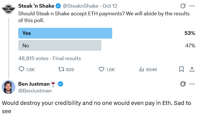 Steak ‘n Shake asked its 468,800 X followers whether it should accept Ether (ETH) on Saturday, promising to “abide by the results of the poll.” The poll saw 53% of 48,815 votes go for “Yes,” but the fast-food chain suspended it around four hours later due to backlash.