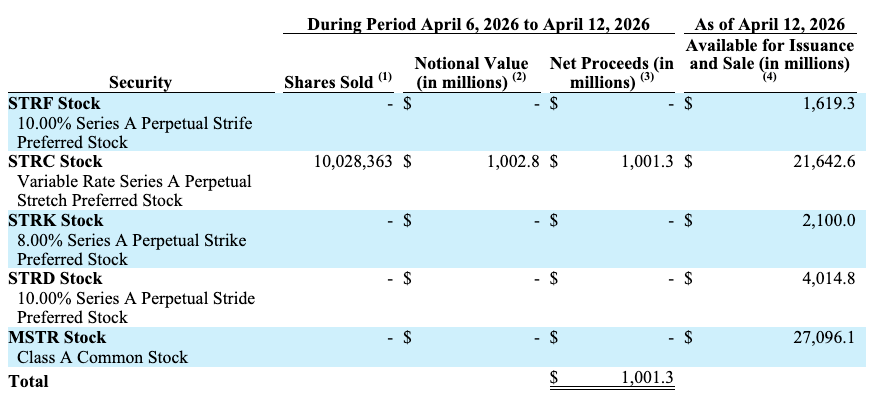 The company sold 10 million STRC shares last week, generating around $1 billion in notional value and net proceeds. No shares were sold for STRF, STRK, STRD or MSTR stock during the period.