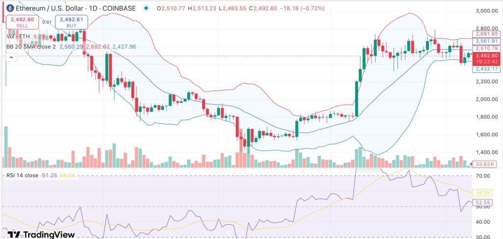 Ethereum’s price is consolidating near $2,500 as institutions quietly ramp up their exposure to ETH. As of press time, Ethereum (ETH) is trading at $2,492, down 0.9% over the last day. The price is close to the lower end of its recent 7-day range between $2,419 and $2,666 and. Market activity appears to be picking up steam despite the slight decline. Ethereum’s 24-hour trading volume has increased by more than 25% to $11.42 billion, indicating a resurgence of investor interest. In line with this, Coinglass data shows that derivatives volume…
