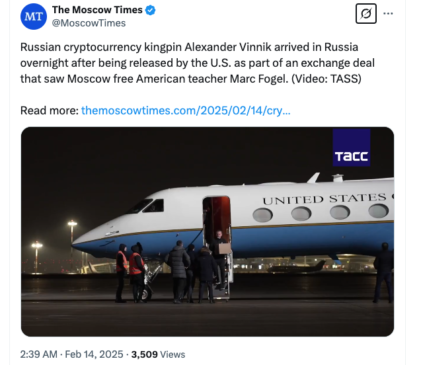 According to a Wall Street Journal report, Vinnik’s prison release from the United States came as part of a US-Russia prisoner swap amid the countries seeking to mend diplomatic ties following Donald Trump’s presidential return in January.