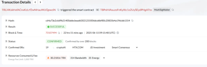 Tether froze the USDt (USDT) at 9:15 am UTC on June 15 on Tron, blockchain data from Tronscan shows.