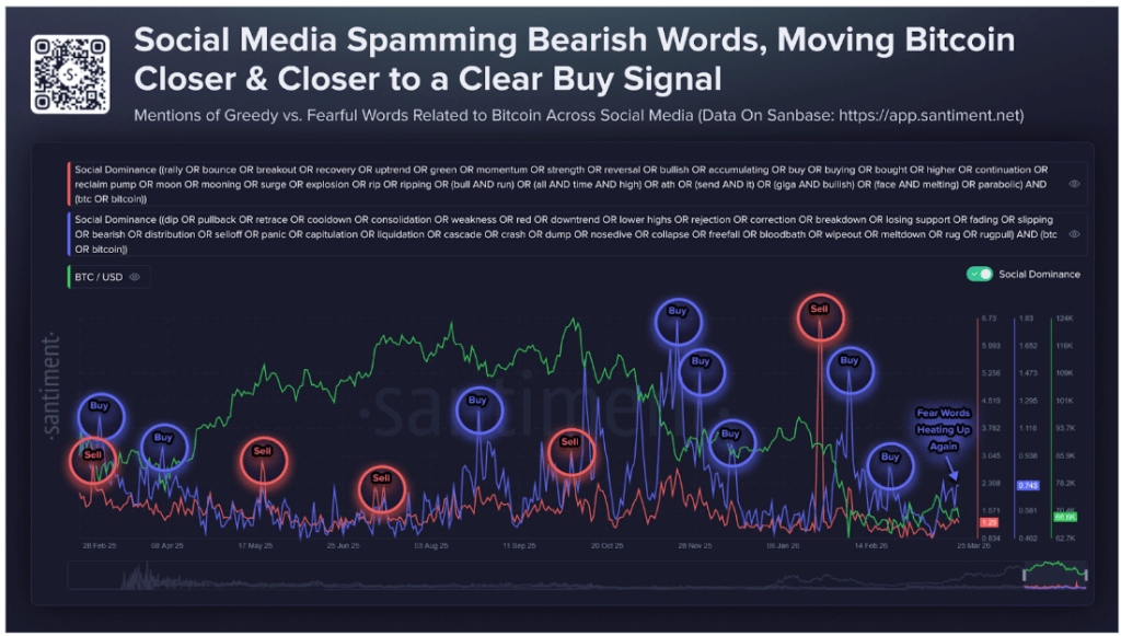 As of late March 2026, Santiment’s chart shows that fearful language is once again heating up, with the metric flagging the current moment as a zone comparable to prior “Buy” signals marked throughout the past 13 months.