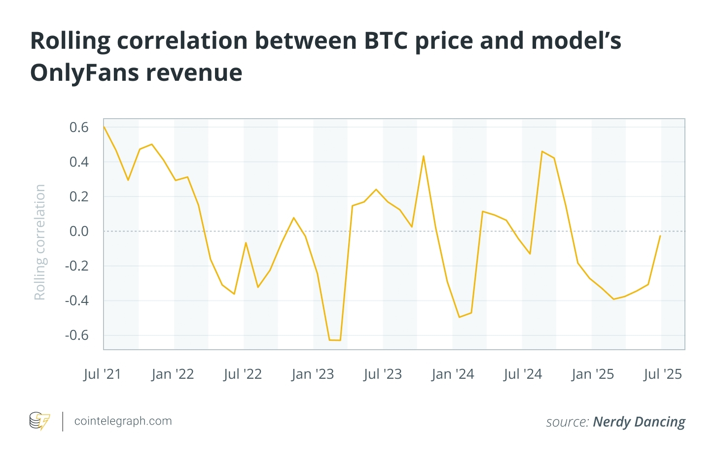 Turns out the stripper index doesn’t really work for Bitcoin. A 57-month revenue analysis of one mid-tier OnlyFans creator shows a negative correlation with Bitcoin’s price, despite the two moving in the same direction more than half the time.