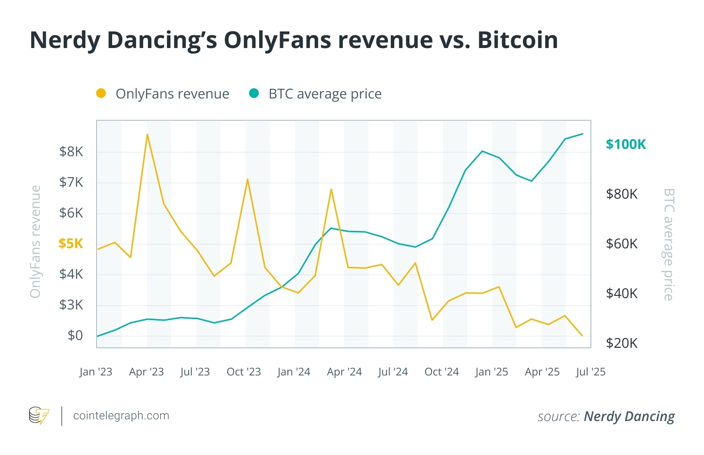 Alana Nguyen, who performs on OnlyFans under the stage name “Nerdy Dancing,” shared her monthly earnings with Cointelegraph since moving online after the 2020 pandemic shut down of the physical world, including strip clubs. So far, she hasn’t noticed any clear correlation between crypto prices and subscriber behavior.