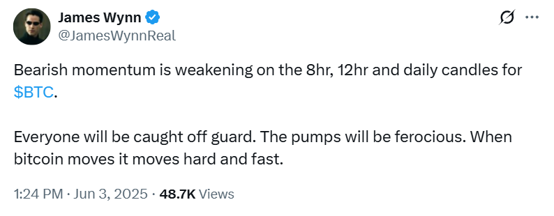 “Bearish momentum is weakening,” wrote Wynn in a follow-up X post on June 3, predicting an incoming Bitcoin rally that will see investors “caught off guard.”