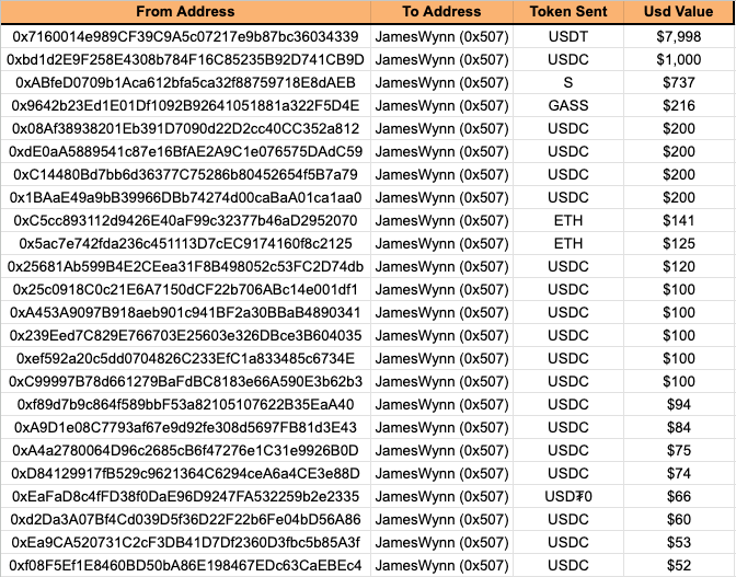 At least 24 blockchain users sent stablecoins to Wynn’s cryptocurrency address, with the largest donation nearly reaching $8,000, according to data compiled by pseudonymous blockchain sleuth “dethective.”