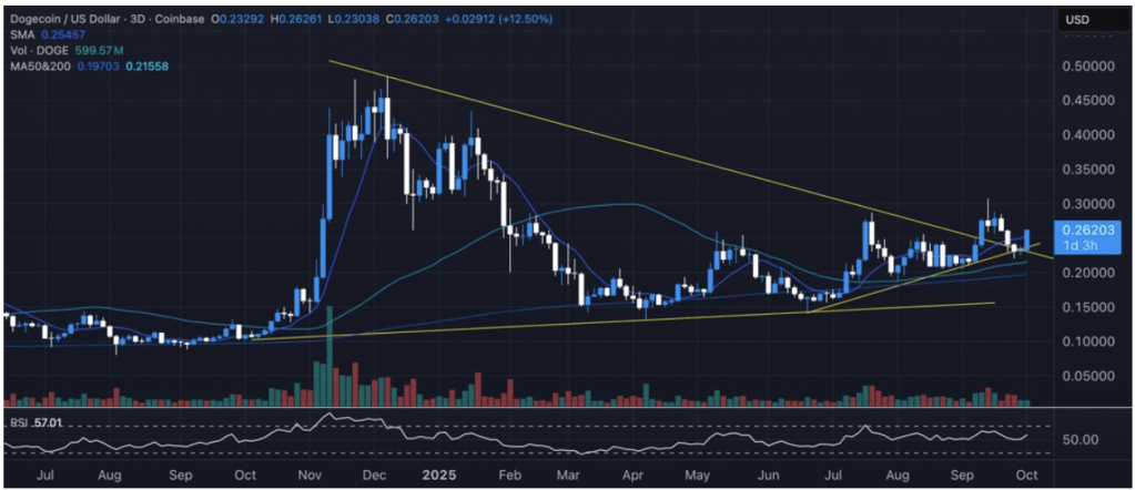 A second technical analysis by crypto market expert Unipcs on X delivers a similar bullish outlook for the Dogecoin price. His chart highlights a tightening wedge structure, where DOGE has been consolidating below long-term resistance while forming a series of higher lows. Recently, the price broke out from this compression zone, reinforcing the meme coin’s bullish narrative.