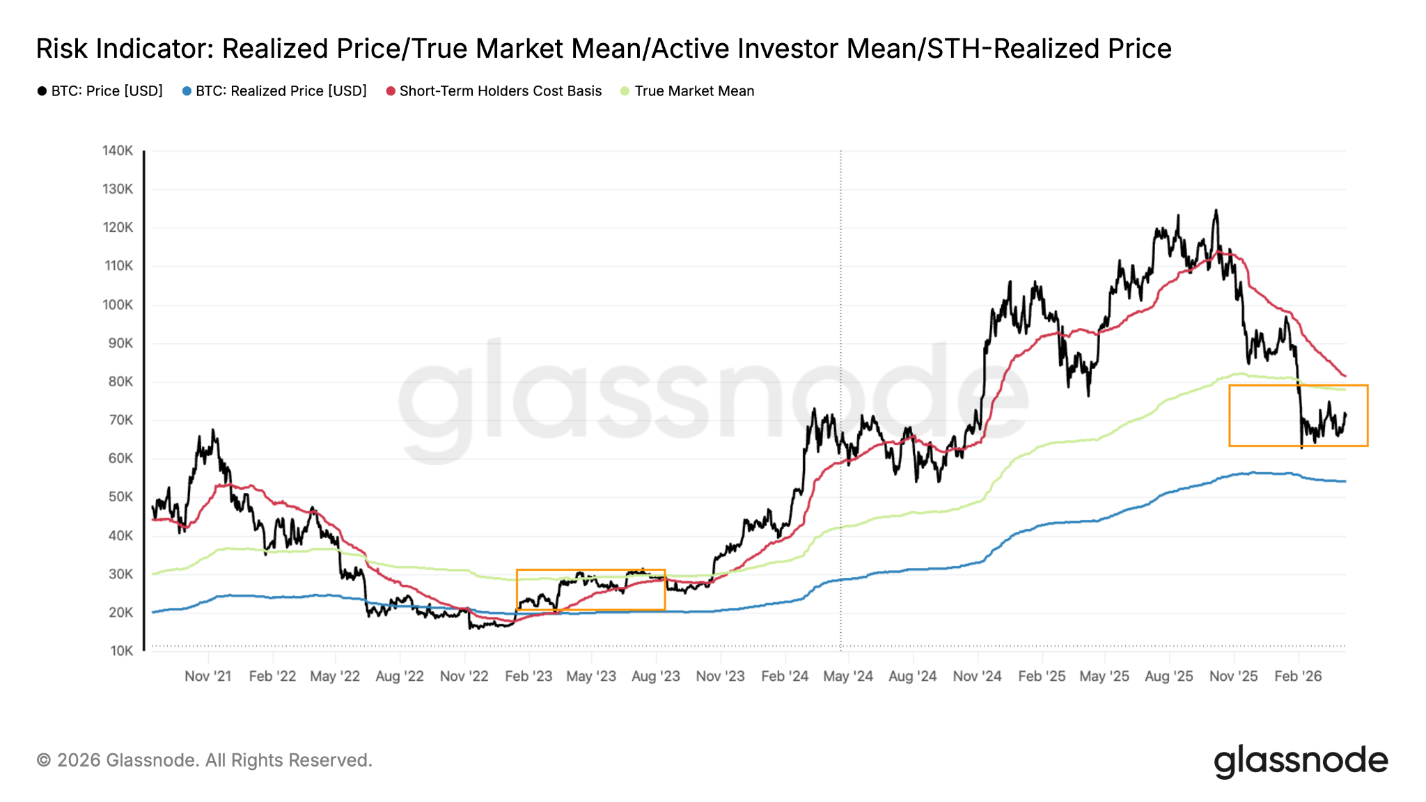 Glassnode’s risk indicator reveals a major resistance between the true market mean at $78,000 and the short-term holder cost basis level around $80,000.