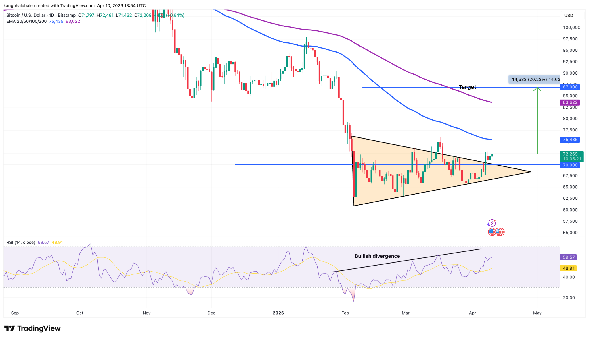 In Bitcoin’s case, the measured move above the upper trend line points to $87,000, about 20% above the current price.