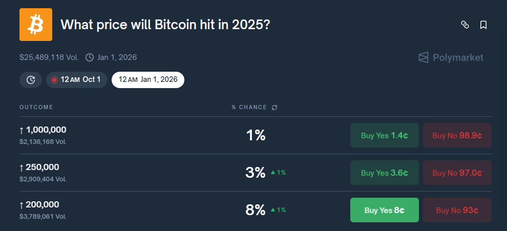 Polymarket users appear unconvinced by Lee’s timetable. At press time, markets show an 8% chance of Bitcoin reaching $200k this year.