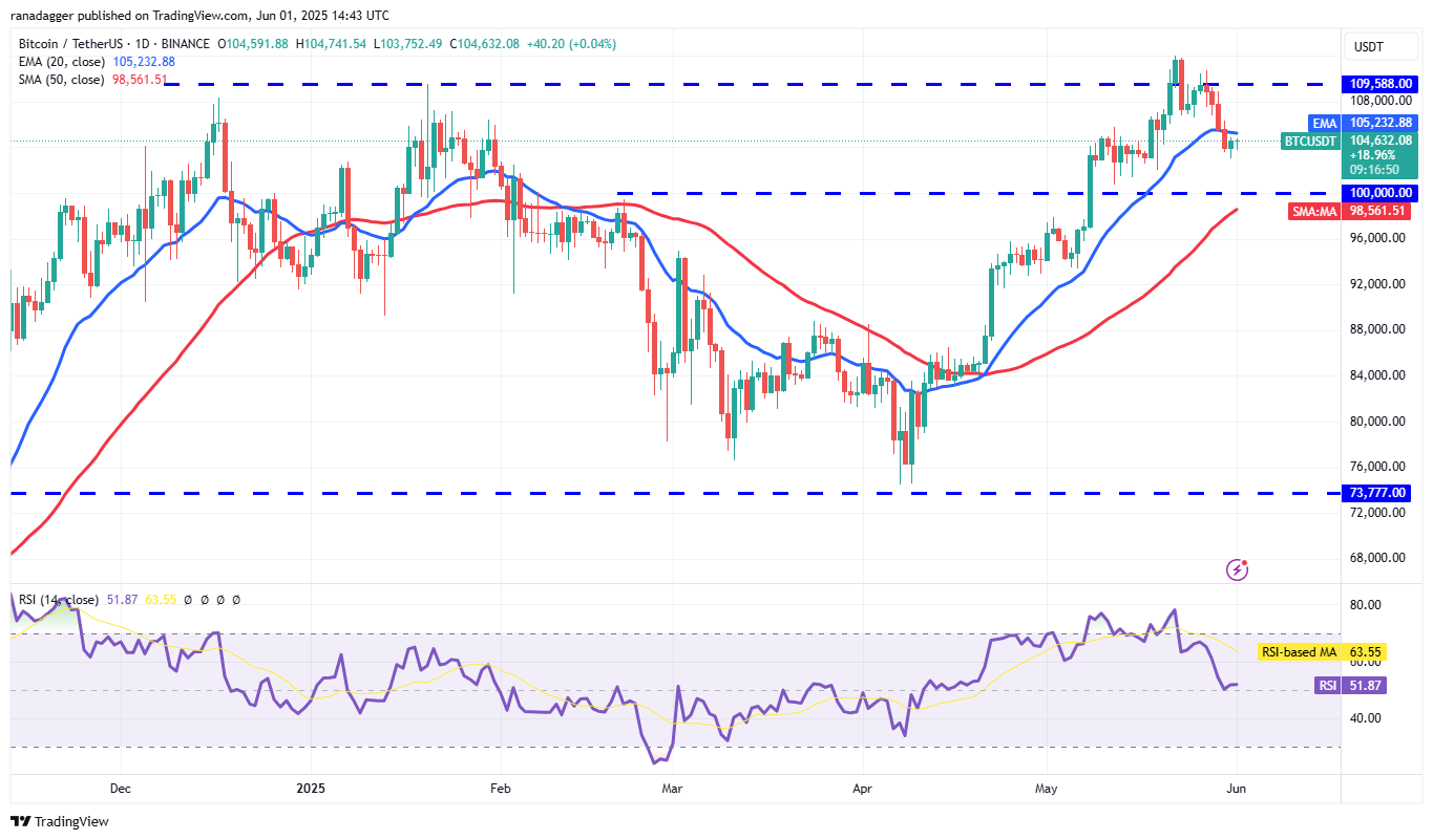 Bitcoin plunged below the 20-day exponential moving average ($105,232) on May 30, signaling weakening bullish momentum.