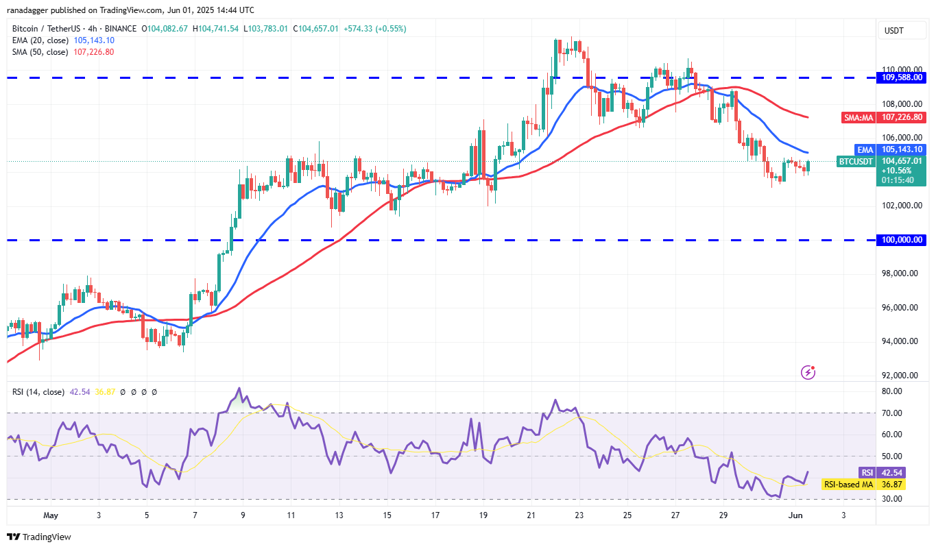 The bulls are trying to push the price back above the 20-day EMA but are likely to face selling at higher levels. If the price turns down from the 20-day EMA, the BTC/USDT pair could drop to $100,000. The bulls are expected to defend the $100,000 level with all their might because a drop below it may start a downtrend toward $93,000.