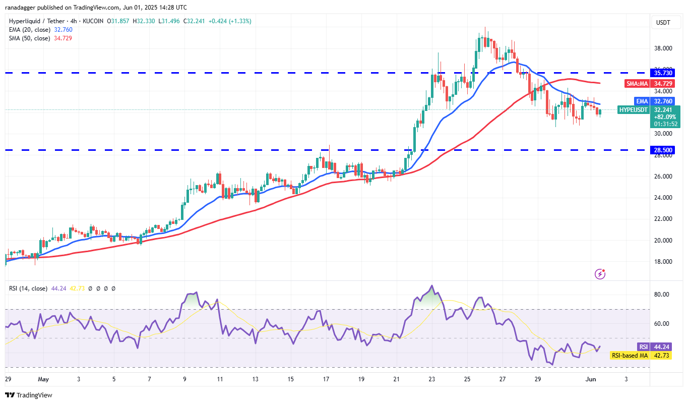Hyperliquid (HYPE) pulled back sharply from $40 on May 26 but is finding support at the 20-day EMA ($30.76).