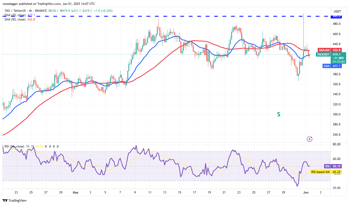 Bittensor (TAO) turned up sharply from the 50-day SMA ($379) on May 31 and reached the $495 overhead resistance.