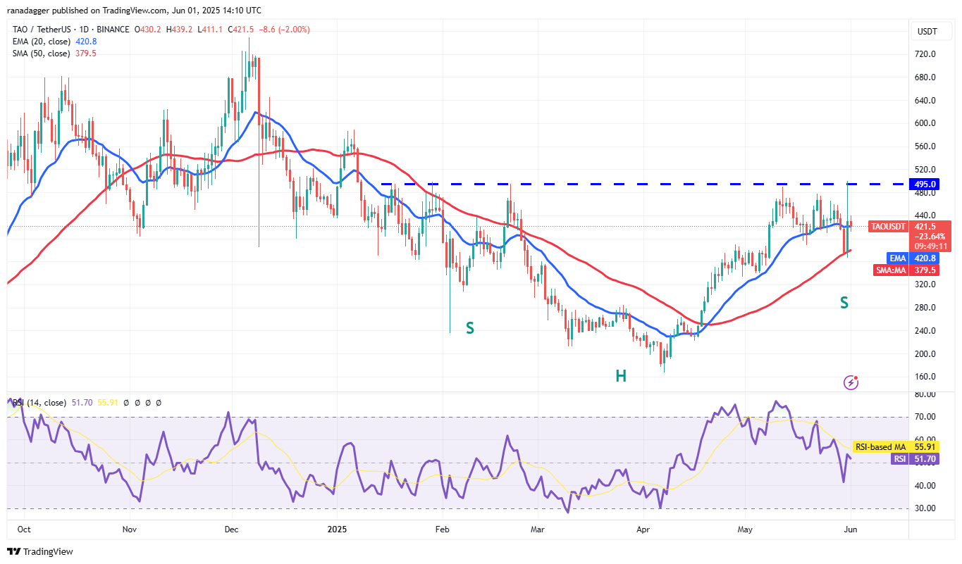 Sellers successfully defended the $495 level, but if the price stays above the 20-day EMA ($421), it suggests that the bulls are buying on dips. That increases the likelihood of a break and close above $495. If that happens, the TAO/USDT pair will complete a bullish inverse head-and-shoulders pattern. The pair could then rally to $589 and later to $720.