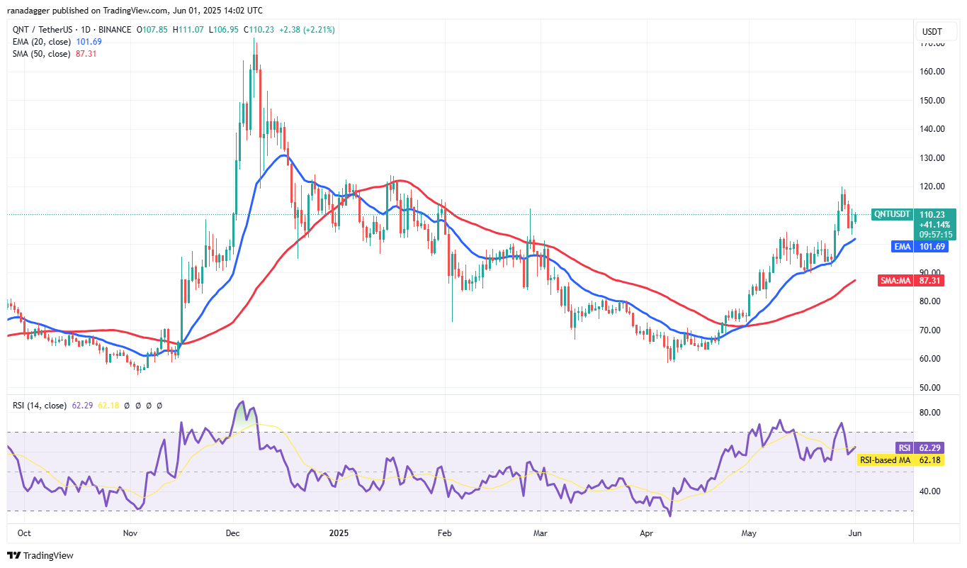 Quant (QNT) turned down from $120 on May 28, but the pullback is finding support at the 20-day EMA ($101).