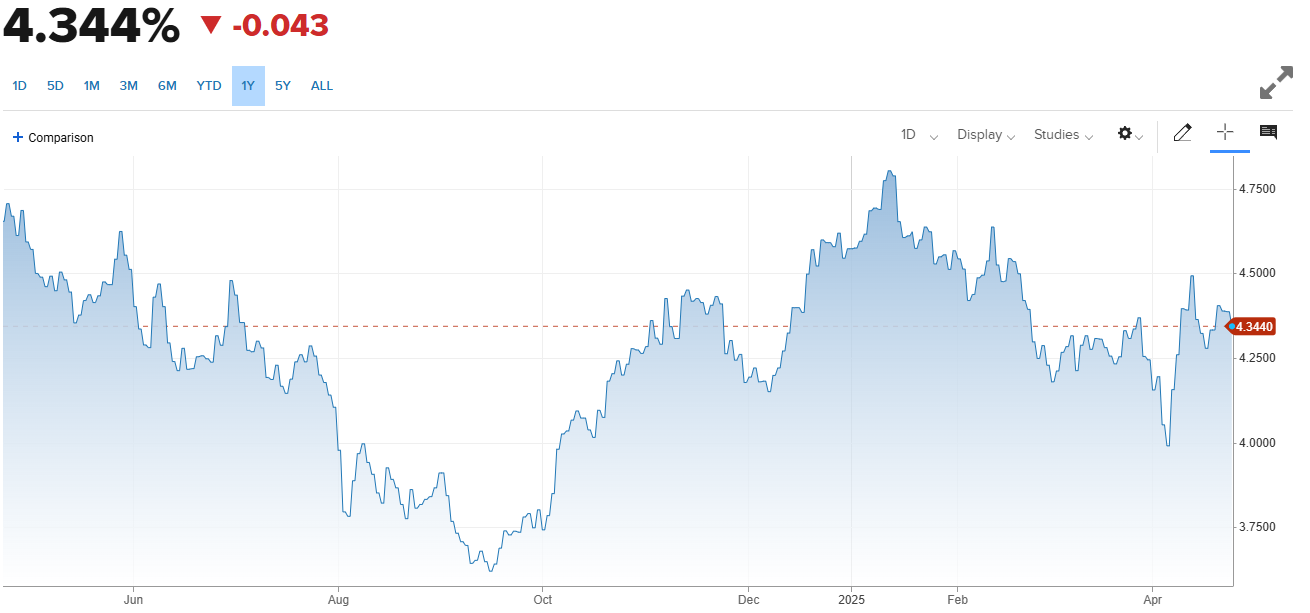 Following Trump’s tariff announcement, the 10-year Treasury yield surged from under 4% to 4.5%, CNBC data shows, amid a sell-off driven by inflation and recession concerns.