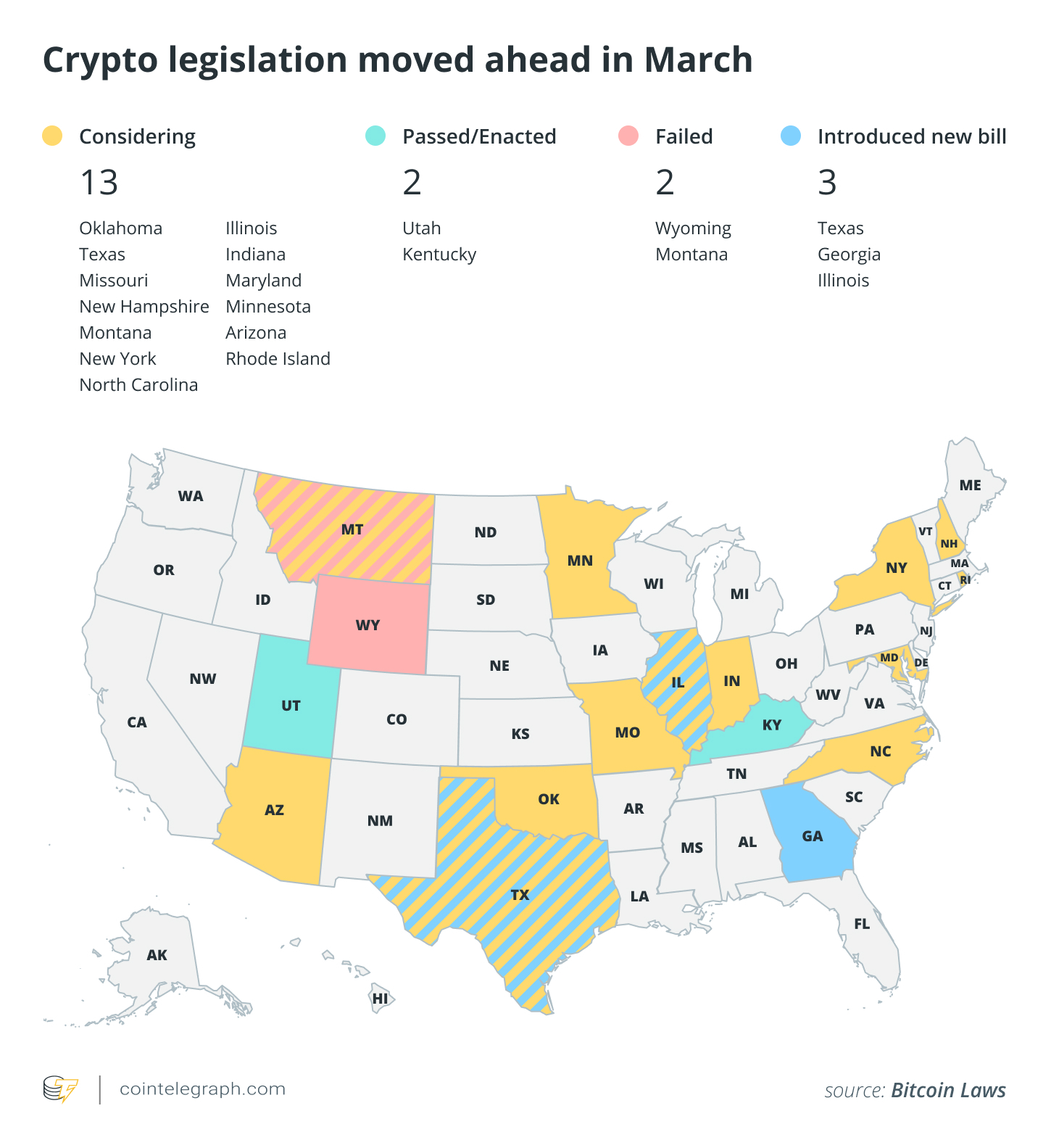 In March, various crypto bills have moved ahead in 13 other states. Three states, Texas, Georgia and Illinois, have introduced new bills in their respective legislatures.