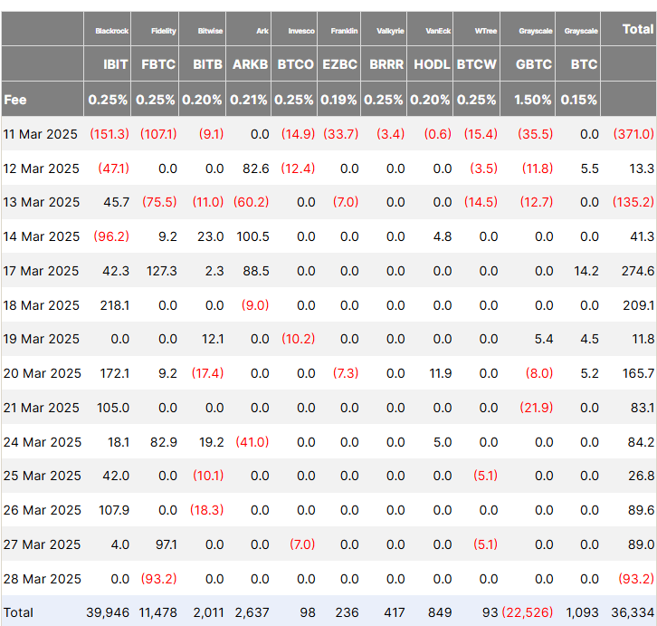 The US spot Bitcoin exchange-traded funds halted their 10-day accumulation streak on March 28 when Fidelity’s ETF recorded over $93 million worth of outflows, while the other ETF issuers registered no inflows or outflows, Farside Investors data shows.