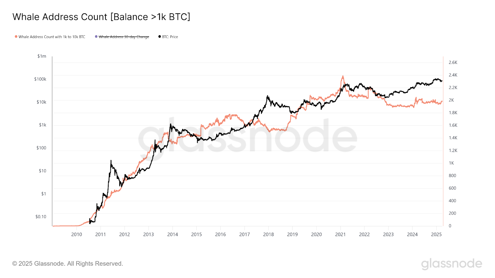Addresses in this category have remained steady since the beginning of 2025, from 1,956 addresses on Jan. 1 to over 1,990 addresses on March 27 — still below the previous cycle’s peak of 2,370 addresses recorded in February 2024, Glassnode data shows.