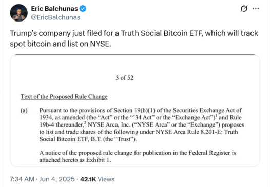 Stock exchange NYSE Arca filed for the Truth Social Bitcoin ETF with the Securities and Exchange Commission on June 3 on behalf of crypto asset manager Yorkville America Digital, a partner of Truth Social’s owner, Trump Media & Technology Group.