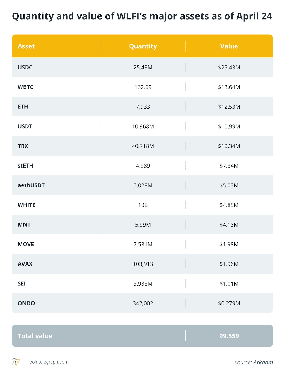 WLFI’s portfolio contains eight cryptocurrencies that are non-stablecoin assets it purchased (versus received via airdrop).