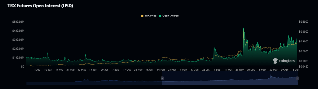 Based on CoinGlass data, TRX derivatives open interest rose by 8.25% over the past 24 hours to $329 million. The weighted funding rate open interest rose to 0.0098%, indicative that bullish long positions are greater than shorts. Short liquidations in the past day were almost double that of longs, which settled a bearish bet wave.