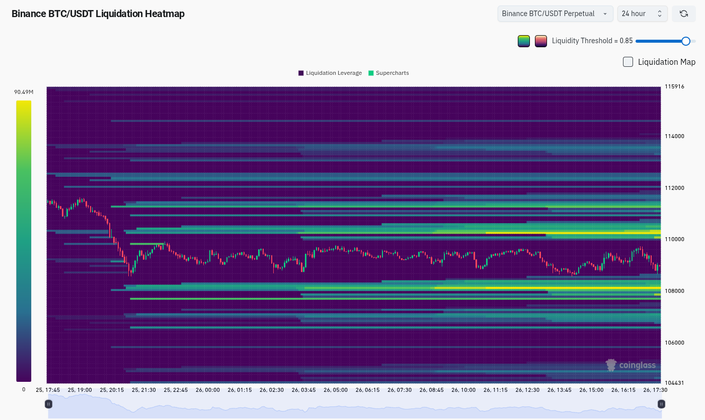 On the largest global exchange, Binance, bids were clustered around $108,200, with short liquidations due at $110,000 and up, per data from CoinGlass.