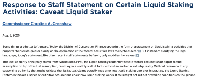 US SEC Commissioner Caroline Crenshaw sharply criticized a staff statement released on Tuesday by the regulator’s Division of Corporation Finance that praised the SEC’s position on liquid staking activities, saying it created more confusion than clarity.